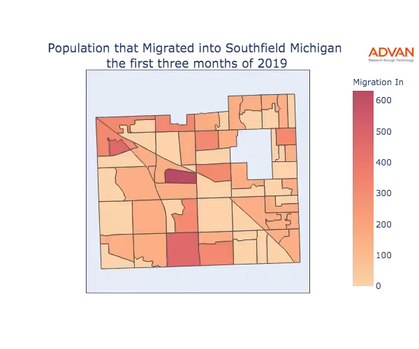 The map below shows the migration into Southfield, MI by Census Block Group (CBG).