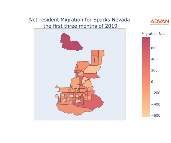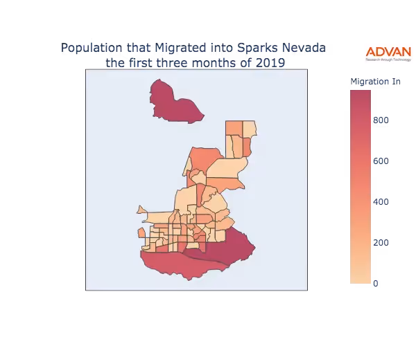 The map below shows the migration into Sparks, NV by Census Block Group (CBG).