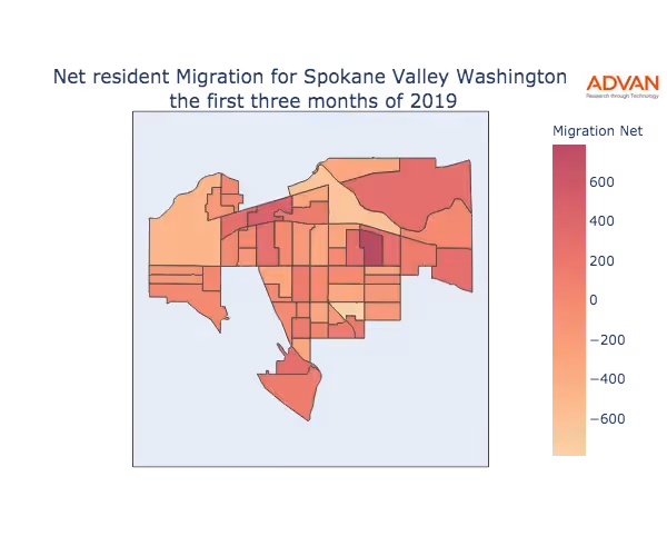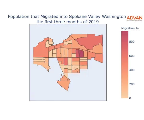 The map below shows the migration into Spokane Valley, WA by Census Block Group (CBG).