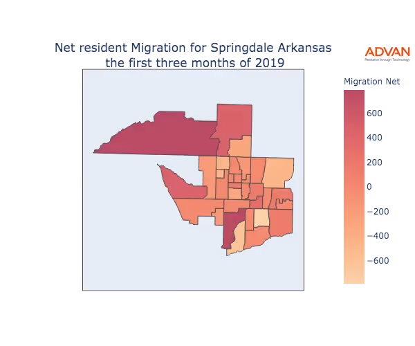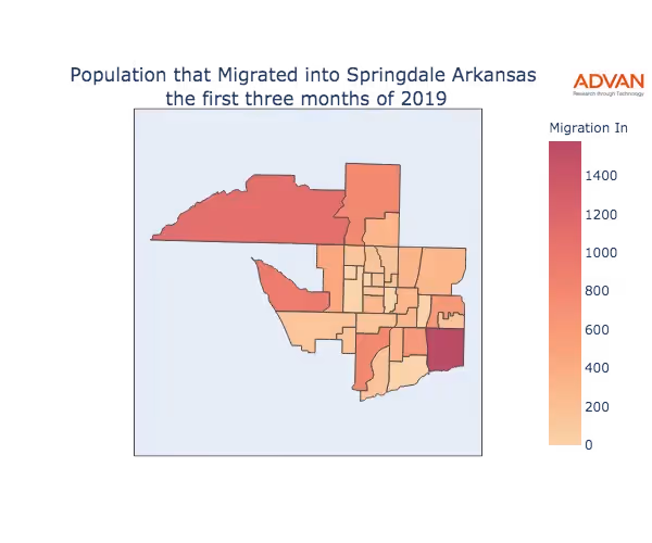 The map below shows the migration into Springdale, AR by Census Block Group (CBG).