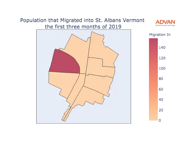 The map below shows the migration into St. Albans, VT by Census Block Group (CBG).