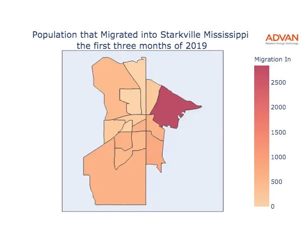 The map below shows the migration into Starkville, MS by Census Block Group (CBG).