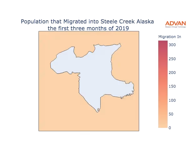 The map below shows the migration into Steele Creek, AK by Census Block Group (CBG).