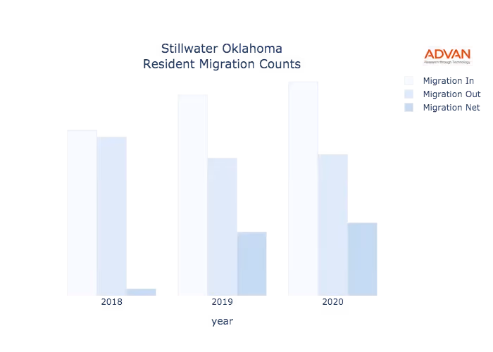 The charts below graph the inbound, outbound and net migration to the city of Stillwater, OK for each year of data available. Data displayed on the charts is annually aggregated; the REPerspectives product allows analysis of mobility trends with monthly granularity by State, Zip, County and Census Block Group.