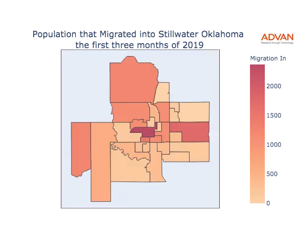 The map below shows the migration into Stillwater, OK by Census Block Group (CBG).