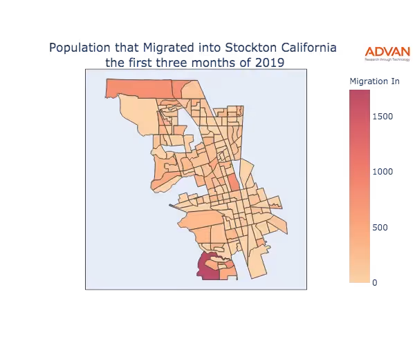 The map below shows the migration into Stockton, CA by Census Block Group (CBG).
