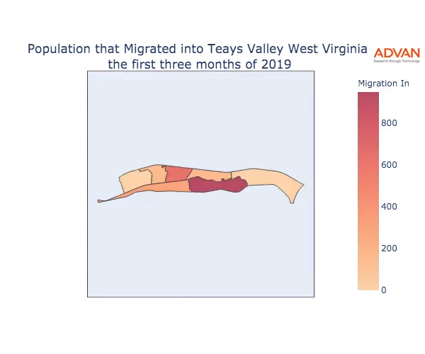 The map below shows the migration into Teays Valley, WV by Census Block Group (CBG).