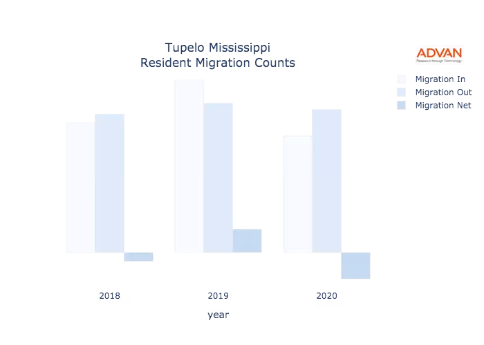 The charts below graph the inbound, outbound and net migration to the city of Tupelo, MS for each year of data available. Data displayed on the charts is annually aggregated; the REPerspectives product allows analysis of mobility trends with monthly granularity by State, Zip, County and Census Block Group.