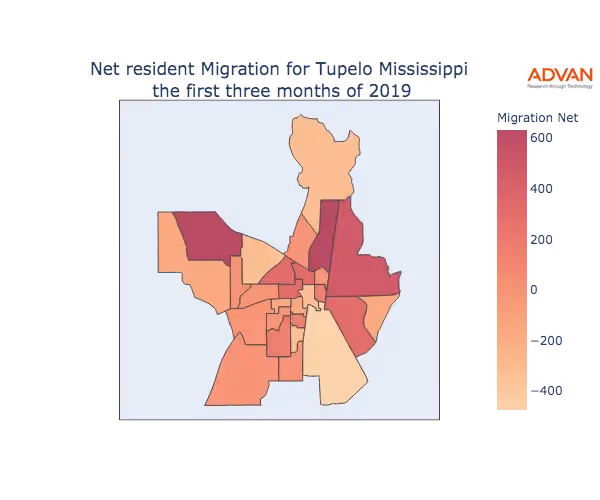 The map below shows the migration into Tupelo, MS by Census Block Group (CBG).