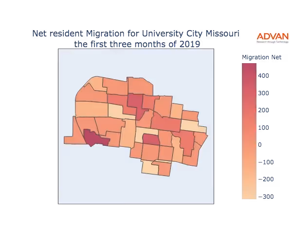 The map below shows the migration into University City, MO by Census Block Group (CBG).