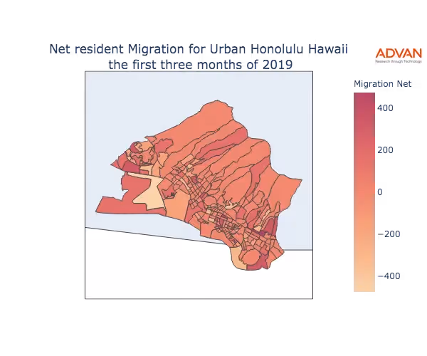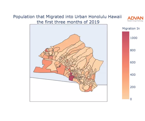 The map below shows the migration into Urban Honolulu, HI by Census Block Group (CBG).