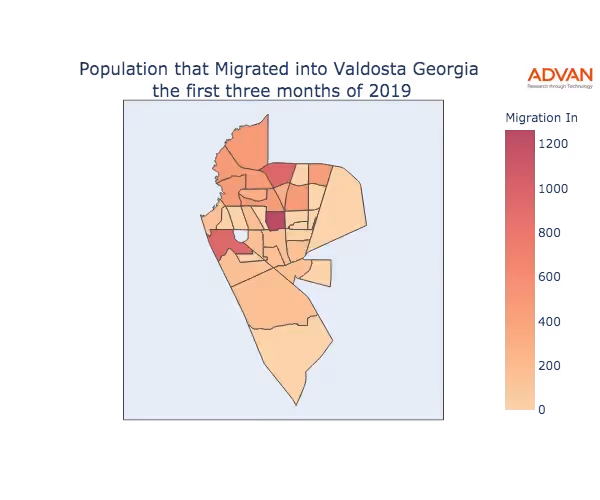 The map below shows the migration into Valdosta, GA by Census Block Group (CBG).