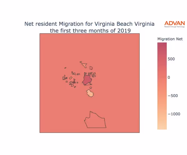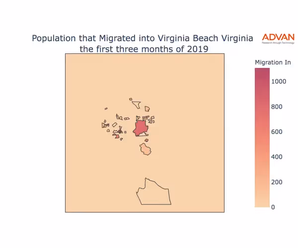 The map below shows the migration into Virginia Beach, VA by Census Block Group (CBG).