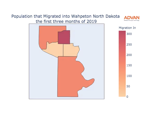The map below shows the migration into Wahpeton, ND by Census Block Group (CBG).
