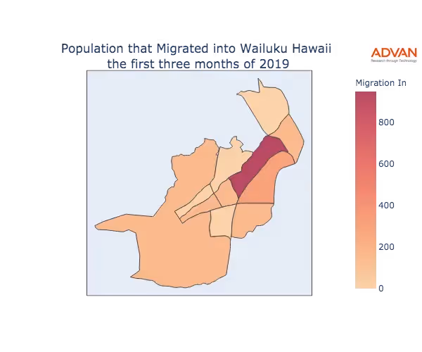 The map below shows the migration into Wailuku, HI by Census Block Group (CBG).