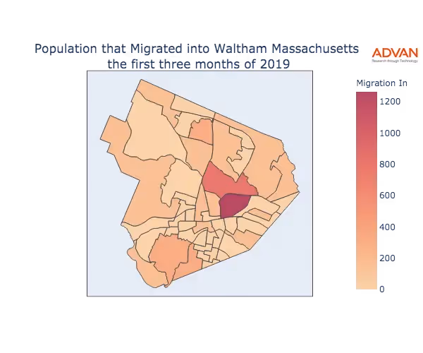 The map below shows the migration into Waltham, MA by Census Block Group (CBG).