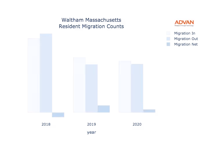 The charts below graph the inbound, outbound and net migration to the city of Waltham, MA for each year of data available. Data displayed on the charts is annually aggregated; the REPerspectives product allows analysis of mobility trends with monthly granularity by State, Zip, County and Census Block Group.