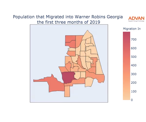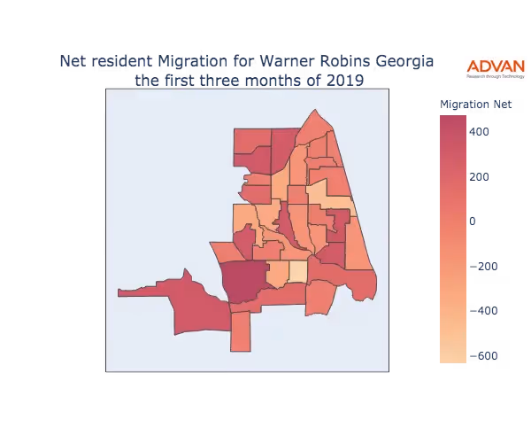 The map below shows the migration into Warner Robins, GA by Census Block Group (CBG).