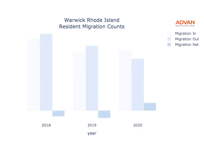 The charts below graph the inbound, outbound and net migration to the city of Warwick, RI for each year of data available. Data displayed on the charts is annually aggregated; the REPerspectives product allows analysis of mobility trends with monthly granularity by State, Zip, County and Census Block Group.