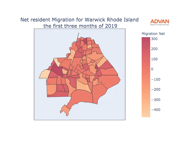The map below shows the migration into Warwick, RI by Census Block Group (CBG).