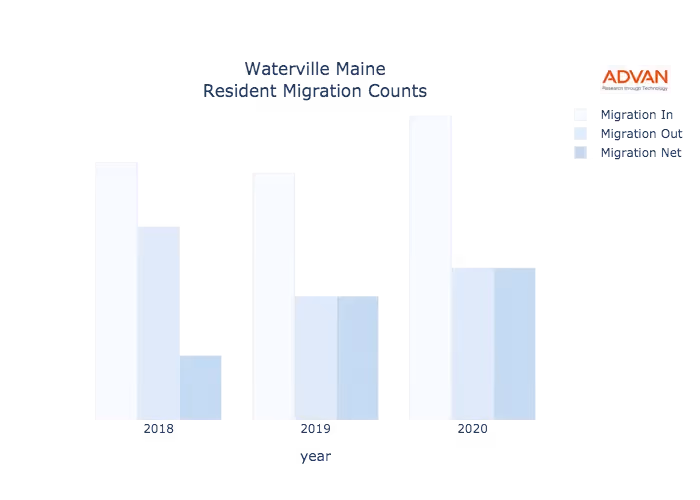 The charts below graph the inbound, outbound and net migration to the city of Waterville, ME for each year of data available. Data displayed on the charts is annually aggregated; the REPerspectives product allows analysis of mobility trends with monthly granularity by State, Zip, County and Census Block Group.