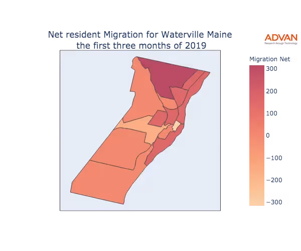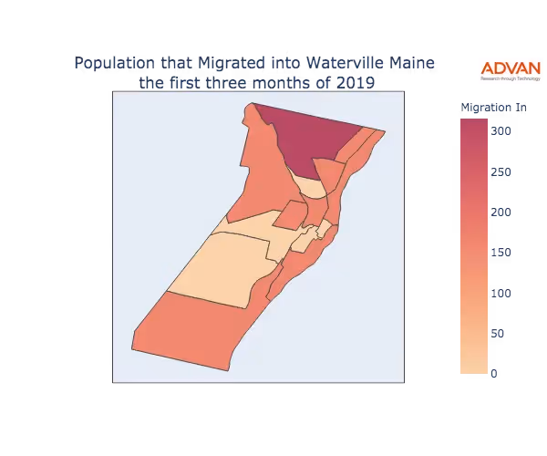 The map below shows the migration into Waterville, ME by Census Block Group (CBG).