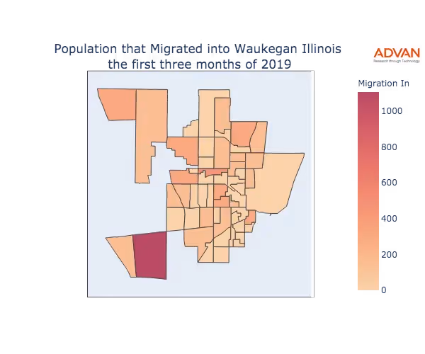 The map below shows the migration into Waukegan, IL by Census Block Group (CBG).