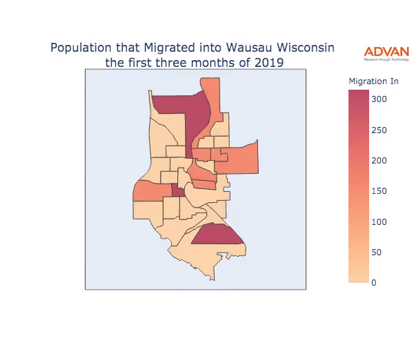 The map below shows the migration into Wausau, WI by Census Block Group (CBG).