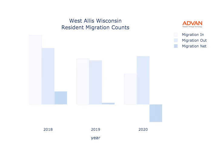 The charts below graph the inbound, outbound and net migration to the city of West Allis, WI for each year of data available. Data displayed on the charts is annually aggregated; the REPerspectives product allows analysis of mobility trends with monthly granularity by State, Zip, County and Census Block Group.