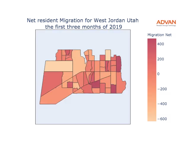 The map below shows the migration into West Jordan, UT by Census Block Group (CBG).