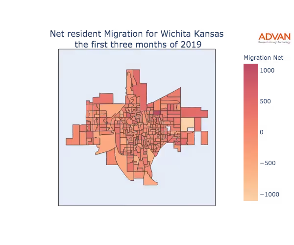 The map below shows the migration into Wichita, KS by Census Block Group (CBG).