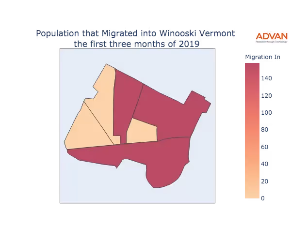 The map below shows the migration into Winooski, VT by Census Block Group (CBG).