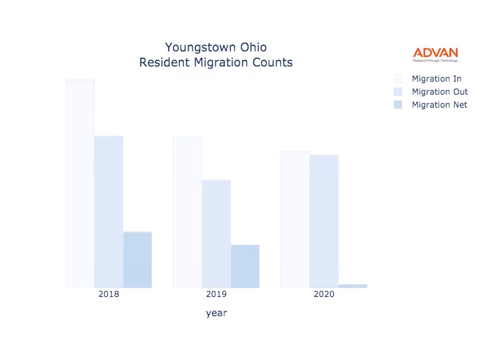 The charts below graph the inbound, outbound and net migration to the city of Youngstown, OH for each year of data available. Data displayed on the charts is annually aggregated; the REPerspectives product allows analysis of mobility trends with monthly granularity by State, Zip, County and Census Block Group.