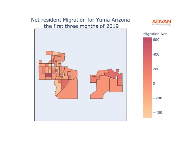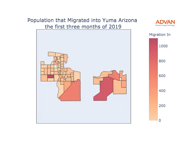 The map below shows the migration into Yuma, AZ by Census Block Group (CBG).