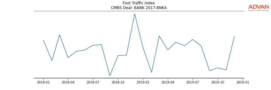 Advan Research computes accurate daily foot-traffic for all the properties and loans of the BANK 2017-BNK4 deal. Here is the foot-traffic aggregated across all the properties of the deal: