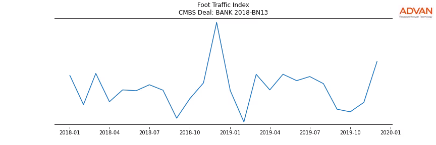 Advan Research computes accurate daily foot-traffic for all the properties and loans of the BANK 2018-BN13 deal. Here is the foot-traffic aggregated across all the properties of the deal: