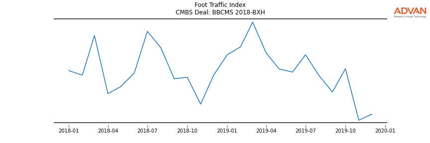 Advan Research computes accurate daily foot-traffic for all the properties and loans of the BBCMS 2018-BXH deal. Here is the foot-traffic aggregated across all the properties of the deal:
