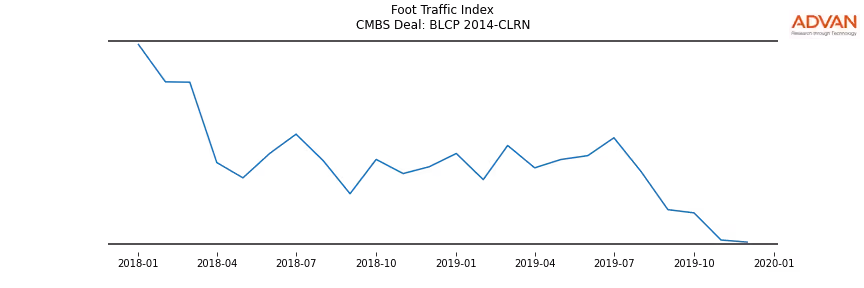 Advan Research computes accurate daily foot-traffic for all the properties and loans of the BLCP 2014-CLRN deal. Here is the foot-traffic aggregated across all the properties of the deal: