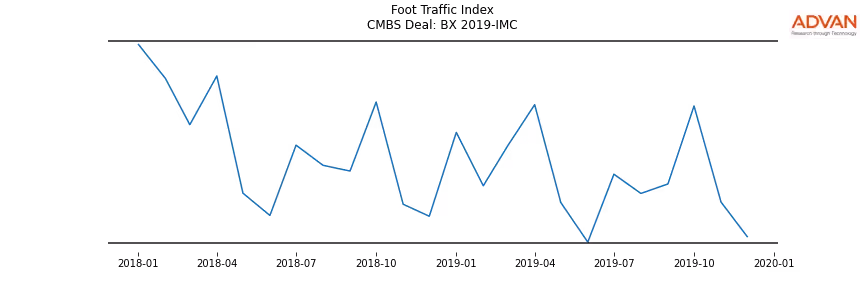 Advan Research computes accurate daily foot-traffic for all the properties and loans of the BX 2019-IMC deal. Here is the foot-traffic aggregated across all the properties of the deal: