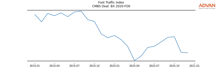 Advan Research computes accurate daily foot-traffic for all the properties and loans of the BX 2020-FOX deal. Here is the foot-traffic aggregated across all the properties of the deal:
