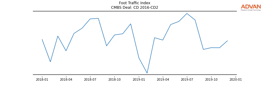 Advan Research computes accurate daily foot-traffic for all the properties and loans of the CD 2016-CD2 deal. Here is the foot-traffic aggregated across all the properties of the deal: