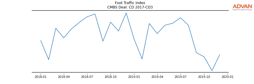 Advan Research computes accurate daily foot-traffic for all the properties and loans of the CD 2017-CD3 deal. Here is the foot-traffic aggregated across all the properties of the deal: