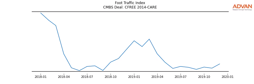 Advan Research computes accurate daily foot-traffic for all the properties and loans of the CFREE 2014-CARE deal. Here is the foot-traffic aggregated across all the properties of the deal: