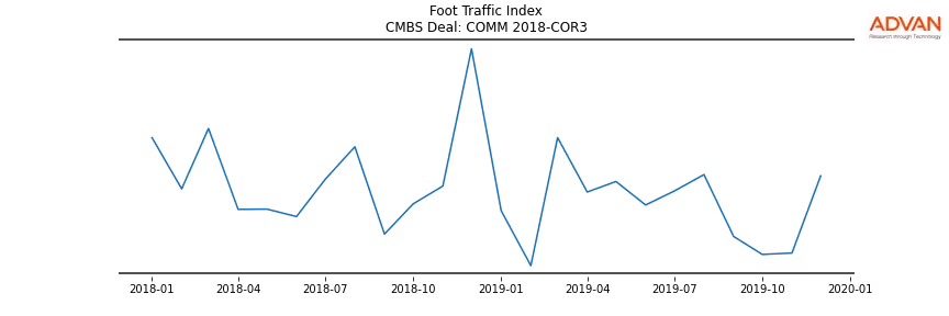 Advan Research computes accurate daily foot-traffic for all the properties and loans of the COMM 2018-COR3 deal. Here is the foot-traffic aggregated across all the properties of the deal: