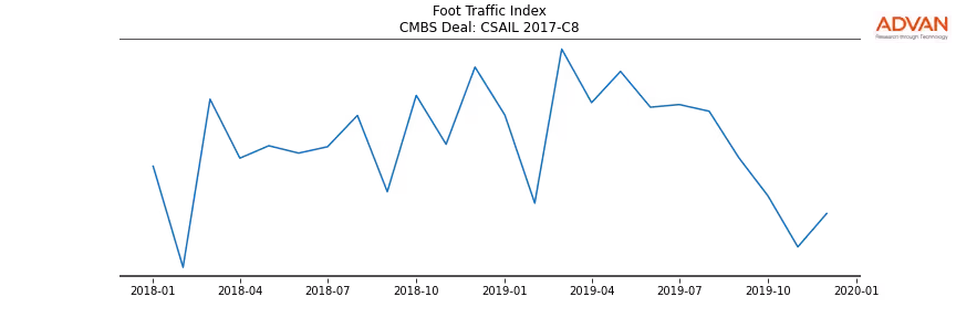 Advan Research computes accurate daily foot-traffic for all the properties and loans of the CSAIL 2017-C8 deal. Here is the foot-traffic aggregated across all the properties of the deal: