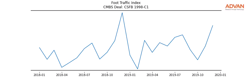 Advan Research computes accurate daily foot-traffic for all the properties and loans of the CSFB 1998-C1 deal. Here is the foot-traffic aggregated across all the properties of the deal: