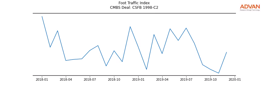 Advan Research computes accurate daily foot-traffic for all the properties and loans of the CSFB 1998-C2 deal. Here is the foot-traffic aggregated across all the properties of the deal: