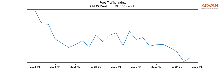 Advan Research computes accurate daily foot-traffic for all the properties and loans of the FREMF 2012-K21I deal. Here is the foot-traffic aggregated across all the properties of the deal: