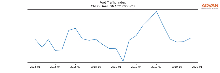 Advan Research computes accurate daily foot-traffic for all the properties and loans of the GMACC 2000-C3 deal. Here is the foot-traffic aggregated across all the properties of the deal: