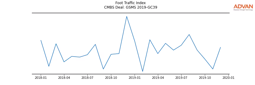 Advan Research computes accurate daily foot-traffic for all the properties and loans of the GSMS 2019-GC39 deal. Here is the foot-traffic aggregated across all the properties of the deal: